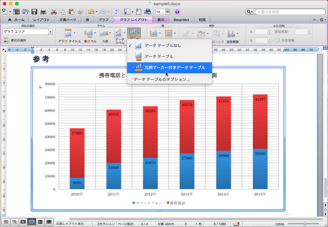 - [ラベル]グループの[データテーブル]をクリックし、[凡例マーカー付きでデータテーブル]を指定します。