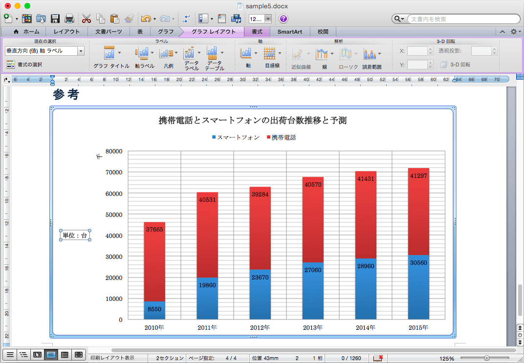 縦軸にラベル「単位:台」を追加してみましょう。