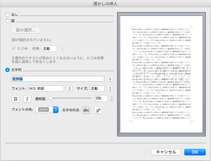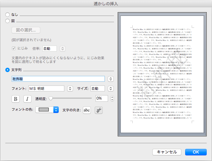 ページの背景に透かしを設定することができます。Word 2011の透かし機能はWord 2003までのバージョンとほぼ同じです。選択できる文字列は以下の通りです。一覧に指定したいものがない場合は任意の文字列に設定することも可能です。