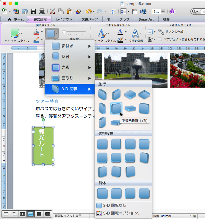 - ついでに、3-D効果も適用してみます。[3-D効果]をポイントして[不等角投影1(右)]を選択してみます。