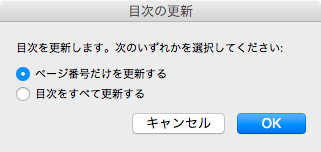 - [目次の更新]ダイアログボックスが表示されたら、[ページ番号だけを更新する]が選択されているのを確認し[OK]ボタンをクリックします。