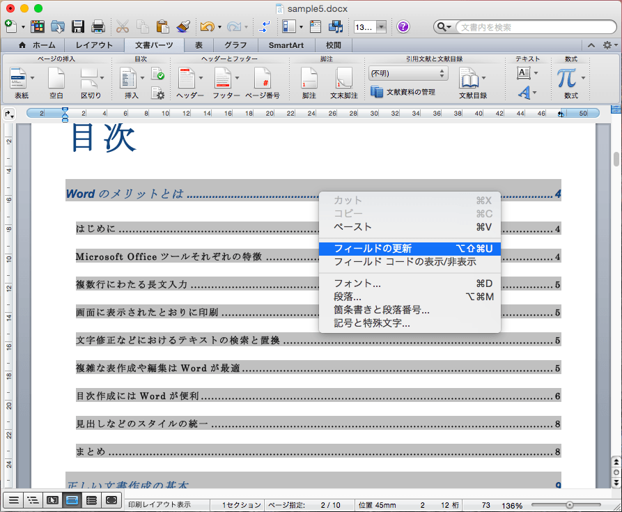 目次内を右クリックしてショートカットメニューより[フィールドの更新]またはcommand+option+shift+Uキーをクリックしても[目次の更新]ダイアログボックスが表示されます。