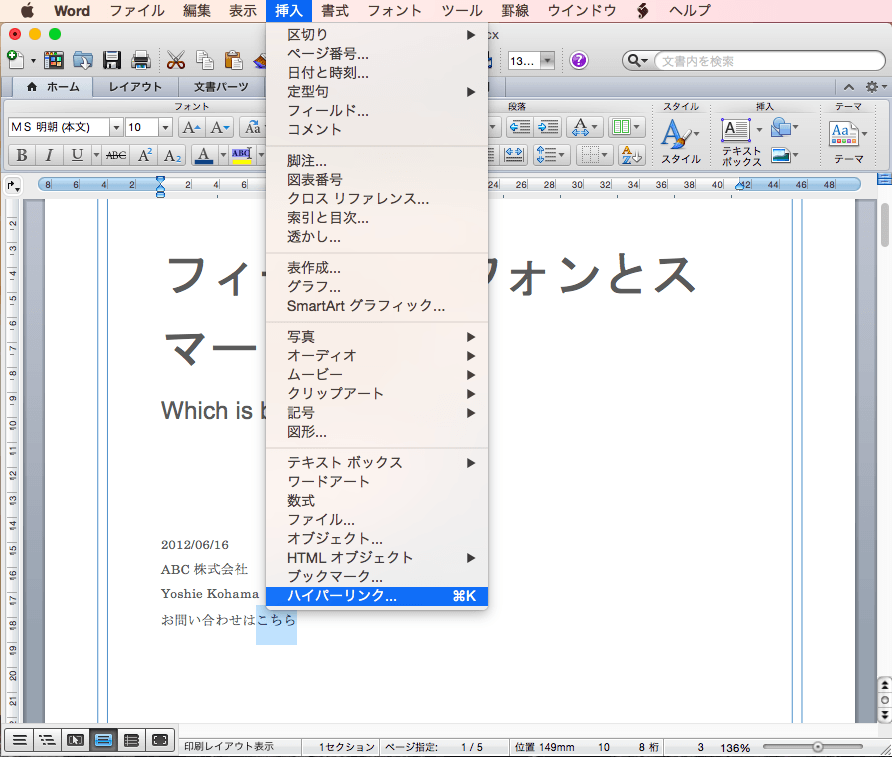 - [挿入]メニューの[ハイパーリンク]をクリックします。