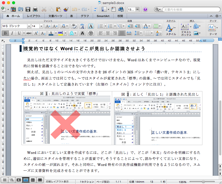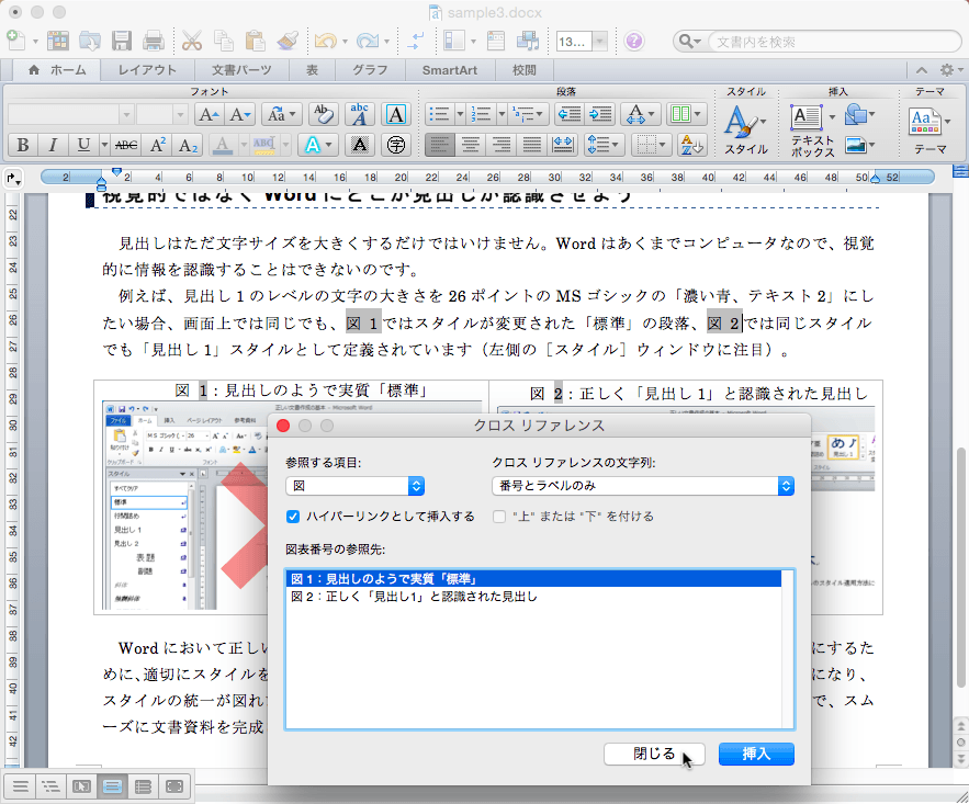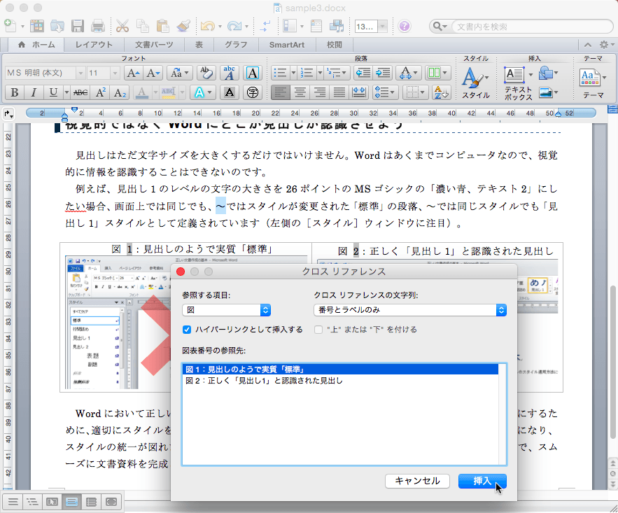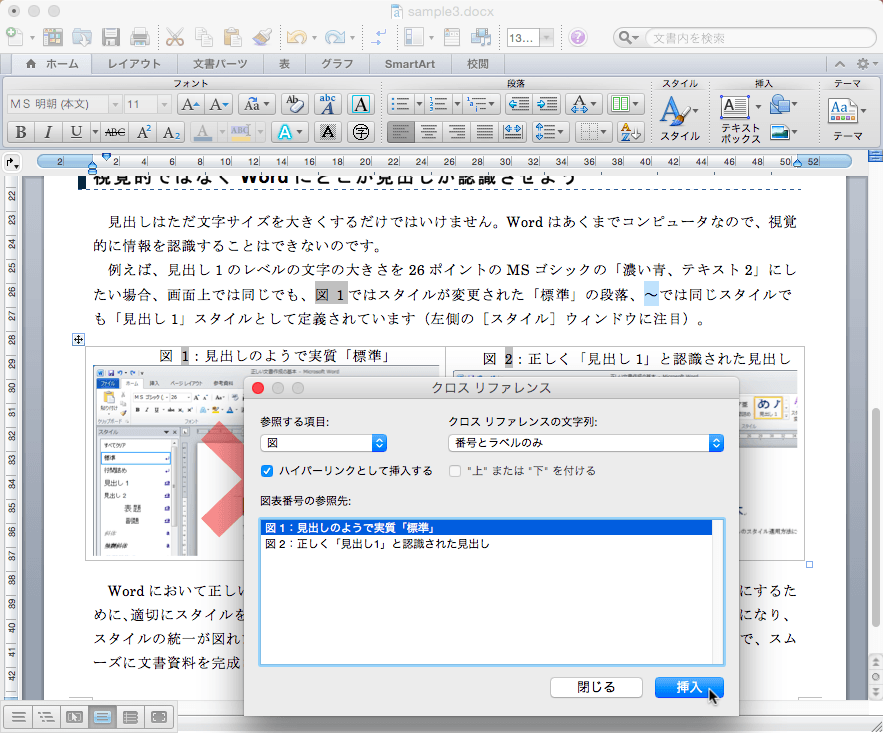 - [クロスリファレンス]ダイアログボックスの[図表番号の参照先]一覧から[図2:正しく「見出し1」として認識された見出し]を選択して[挿入]ボタンをクリックします。