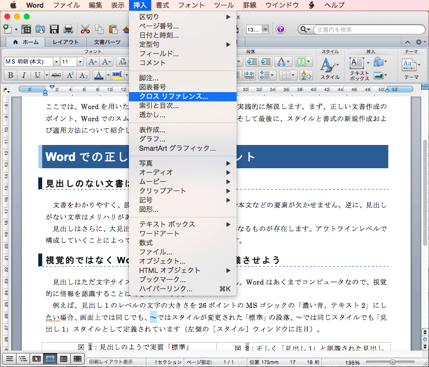 - [挿入]メニューの[クロスリファレンス]をクリックします。