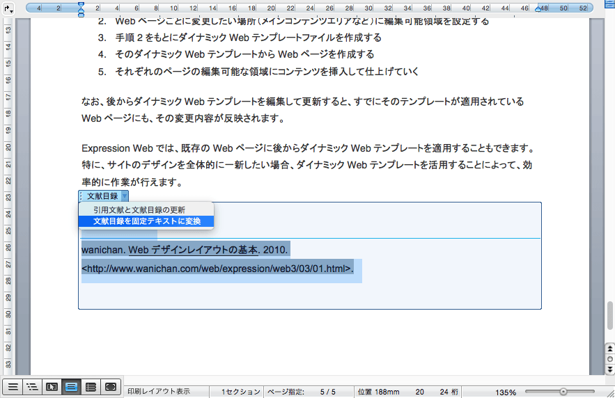 引用文献の一覧または文献目録を固定テキストに変換するには