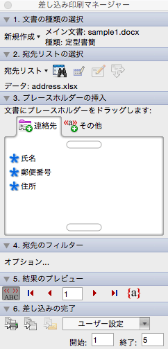 - [差し込み印刷マネージャー]の[6. 差し込みの完了]で、ポップアップメニューから[ユーザー設定]を選択します。