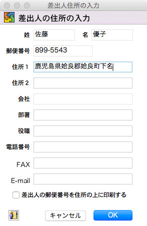 - [差出人住所の入力]ダイアログボックスが表示されるので、それぞれ入力して[OK]ボタンをクリックします。