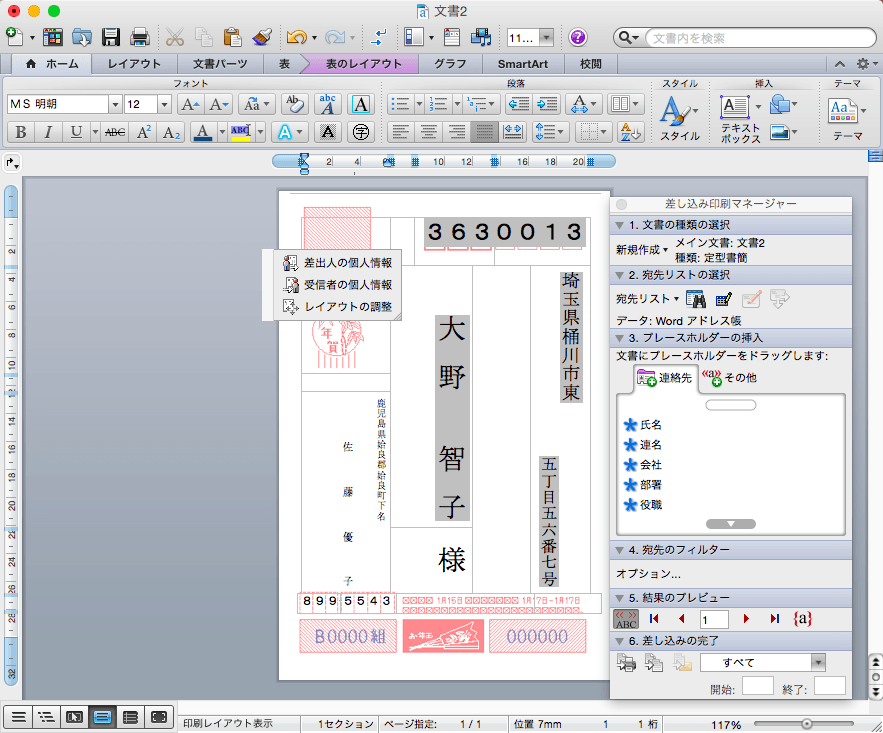 はがき宛名印刷ウィザードのときに差出人を印刷しないようにした場合など、差出人住所をあとで入力するには、画面上の[差出人の個人情報]をクリックします。