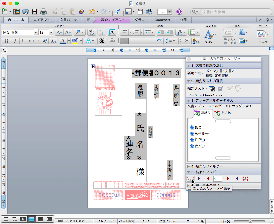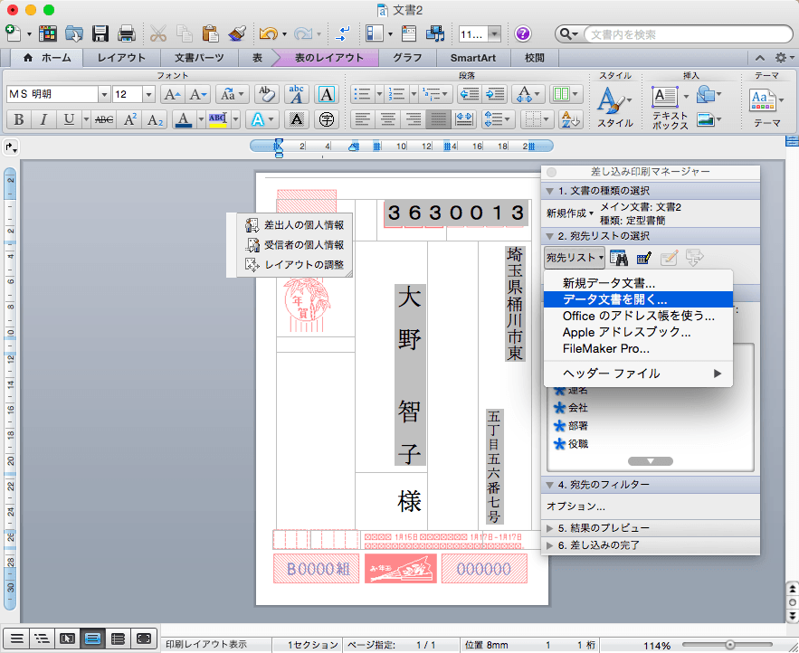 あらかじめExcelで住所録を作ったものをはがきの宛名印刷に使用することができます。ただし、Word 2011での縦書きの宛名の場合、元データをすべて漢数字に変換しておく必要があります。
