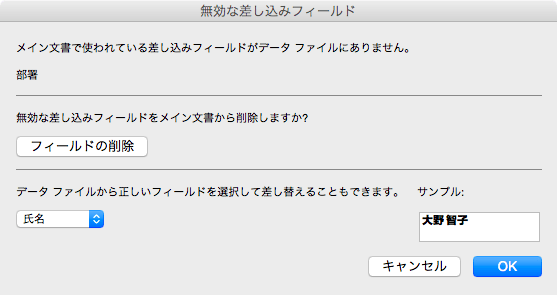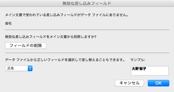 メイン文書で使われている差し込みフィールドが差し替えるExcelの住所録ファイルにない場合、フィールドを削除するか、データファイルから正しいフィールドを選択して差し替えなければいけません。