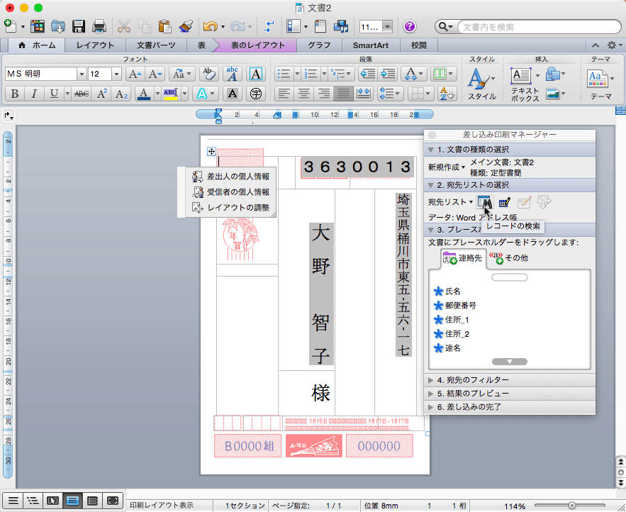 - [差し込み印刷マネージャー]の[2. 宛先リストの選択]の[レコードの検索]をクリックします。