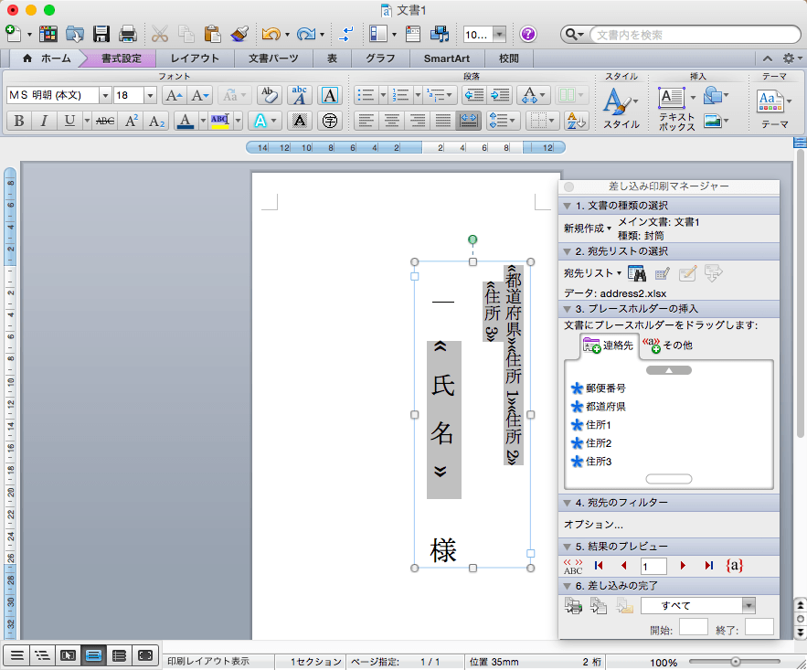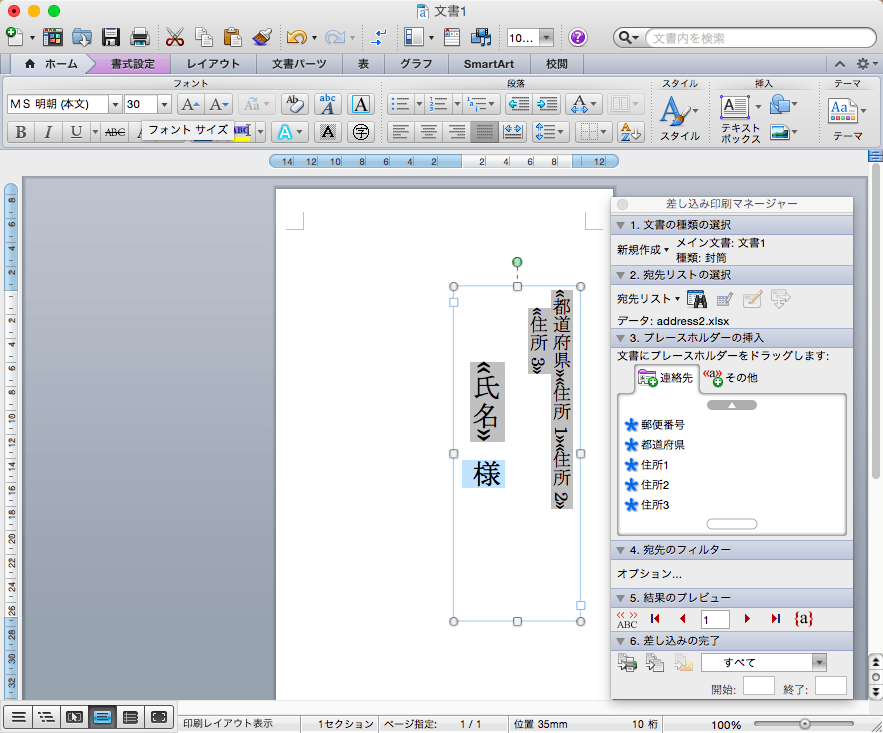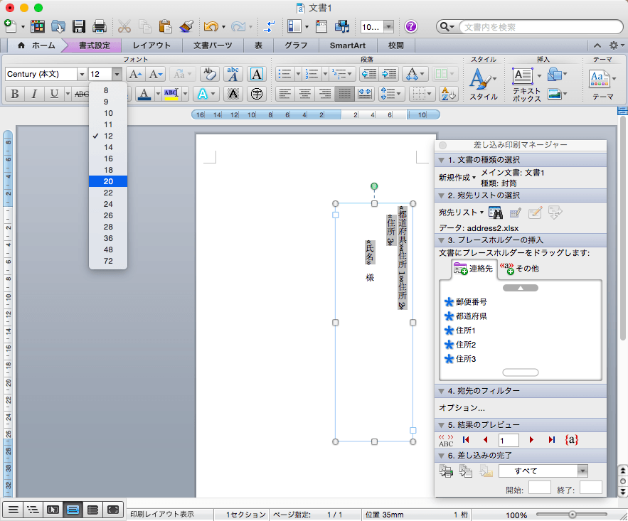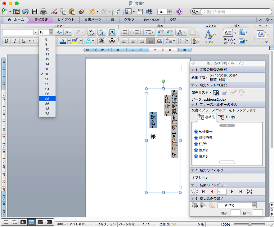 - 宛名フィールドを選択して、フォントサイズを28ポイントにします。