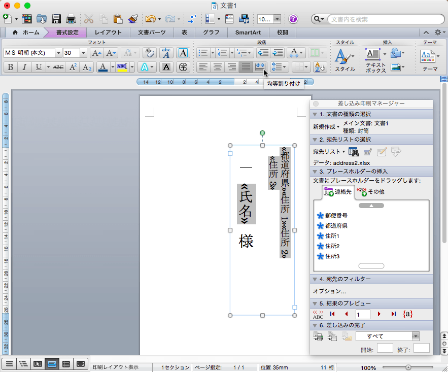 テキストボックス内の書式は、12ポイントのMS明朝となり、宛名書きとしては文字が小さすぎます。宛名の間隔を広げるには、均等割り付けを利用するとよいでしょう。ここでは、宛名の書式とレイアウトを整える方法について説明します。
