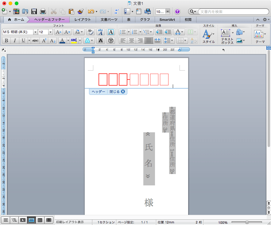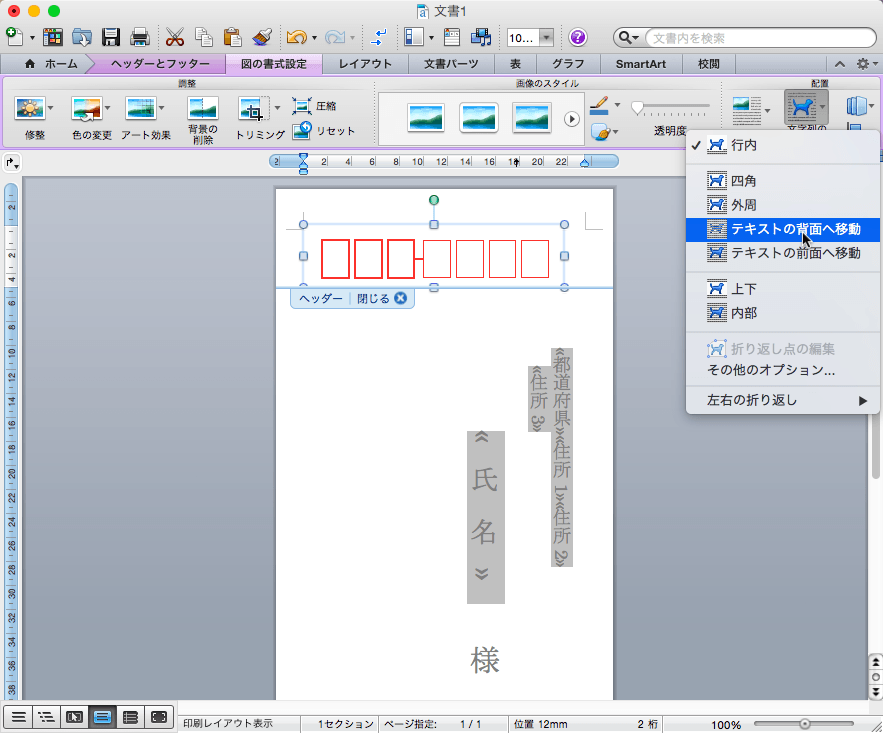 郵便番号枠は右上の画像をコピーして、ヘッダーとフッター領域に貼り付け、その画像の配置を[行内]以外にしてから、所定の位置までドラッグします。ただし、Mac版とWindowsのdpiが異なるので、郵便番号枠のサイズの調整が難しいかもしれません。一般的にはWindowsは96 dpi、Macは72 dpiです。つまり上記の郵便番号枠をWord 2011に貼り付けると約133%拡大されて挿入されます。よって、75%のサイズに変更すればいいと思います。