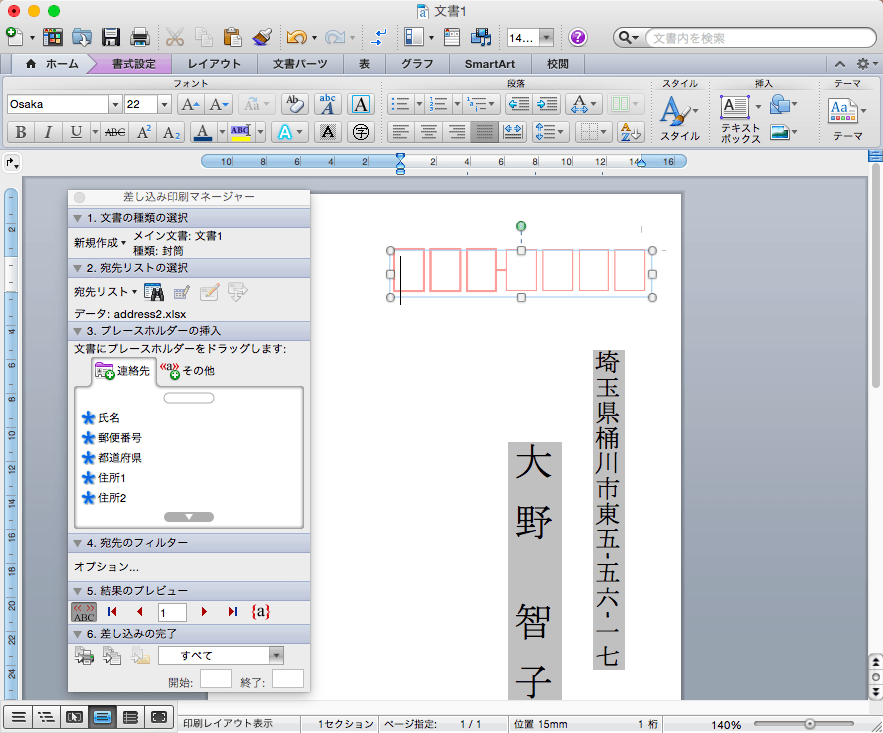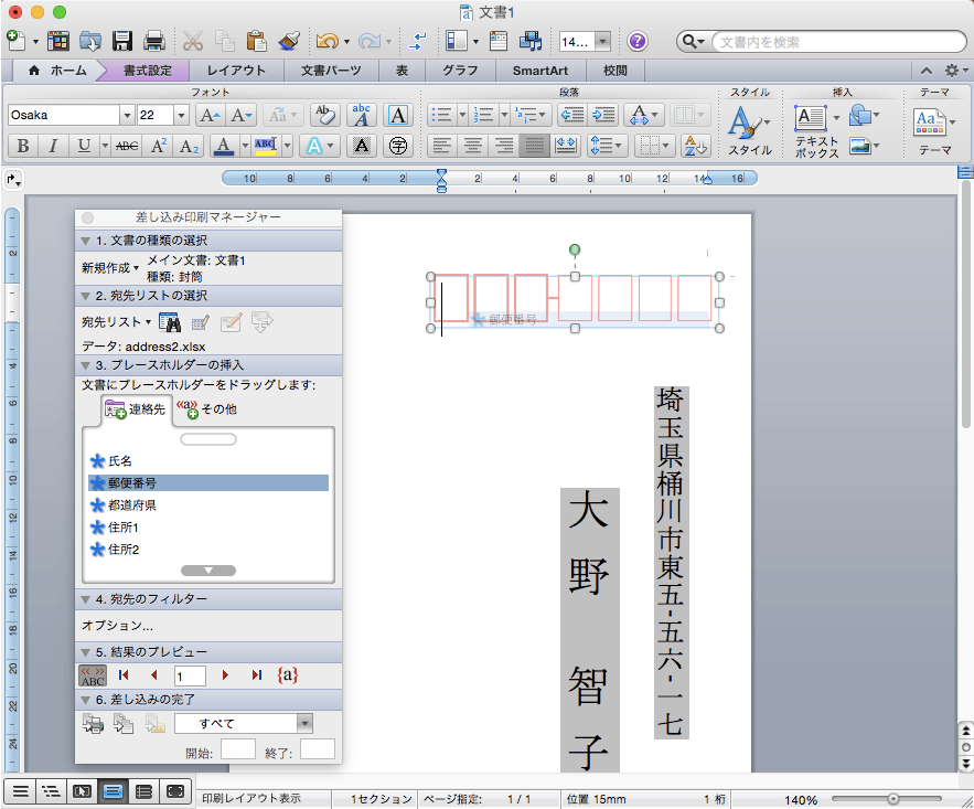 以下の図のように、郵便番号枠内に郵便番号を差し込んでみましょう。