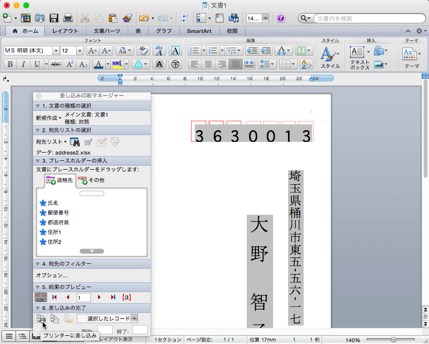 - [差し込み印刷マネージャー]の[5. 結果のプレビュー]の[差し込んだデータの表示]をクリックします。