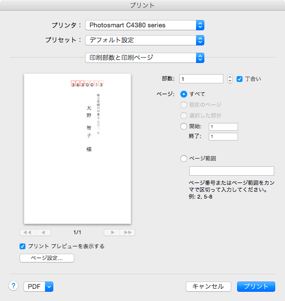 - [プリント]ダイアログボックスが表示されたら、設定内容を確認または変更して[プリント]ボタンをクリックします。