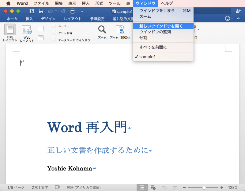 - [ウィンドウ]メニューをクリックし、[新しいウィンドウを開く]を選択します。