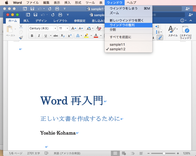 複数の文書を同時に編集する場合、文書を上下に並べて表示できます。[ウィンドウ]メニューの[ウィンドウの整列]をクリックします。