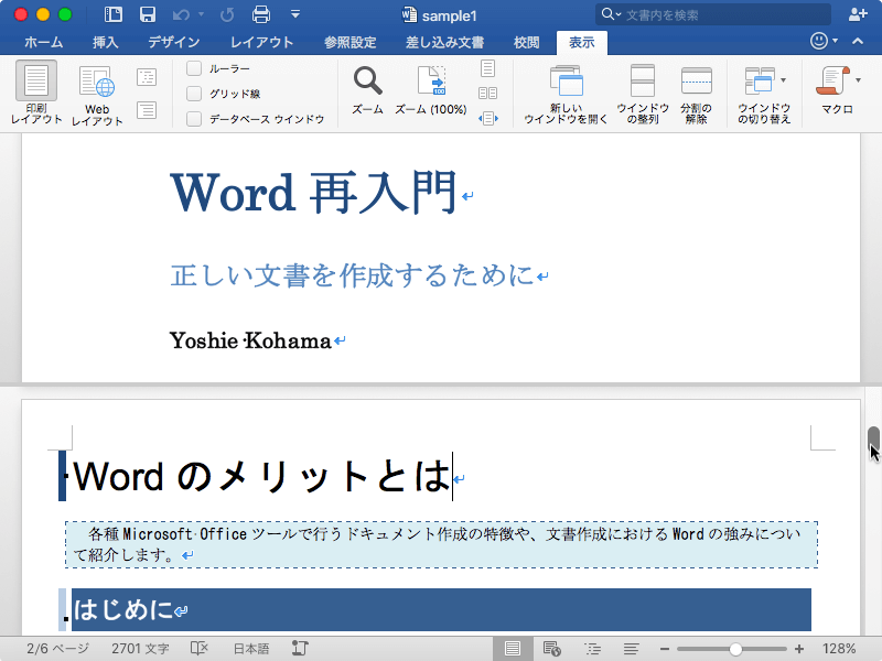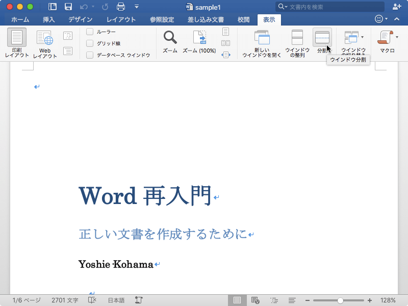 - [表示]タブの[ウィンドウの分割]をクリックするか、[ウィンドウ]メニューの[分割]を選択します。