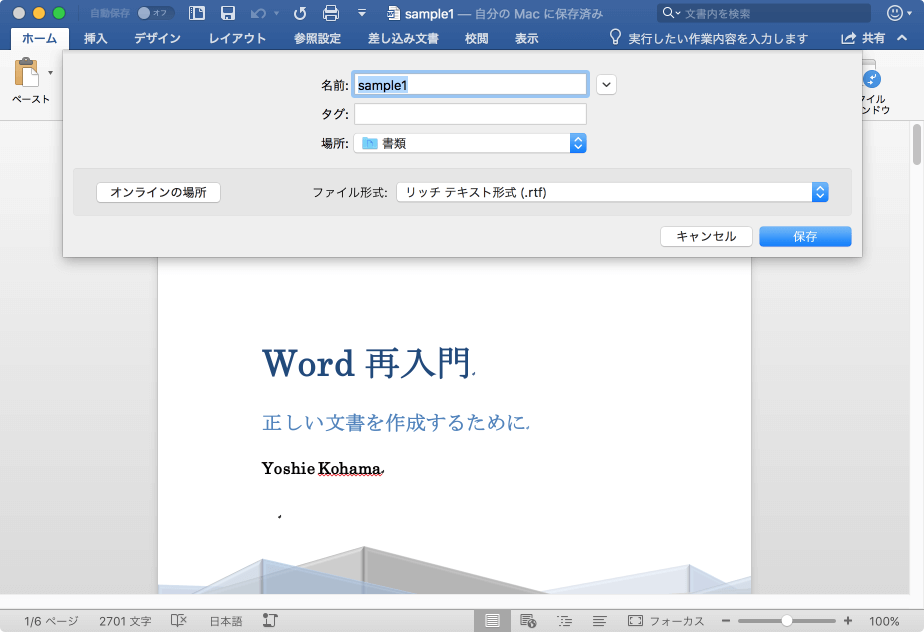 - [ファイル形式]から[リッチテキスト 形式 (.rtf)]を選択して、[保存]ボタンをクリックします。