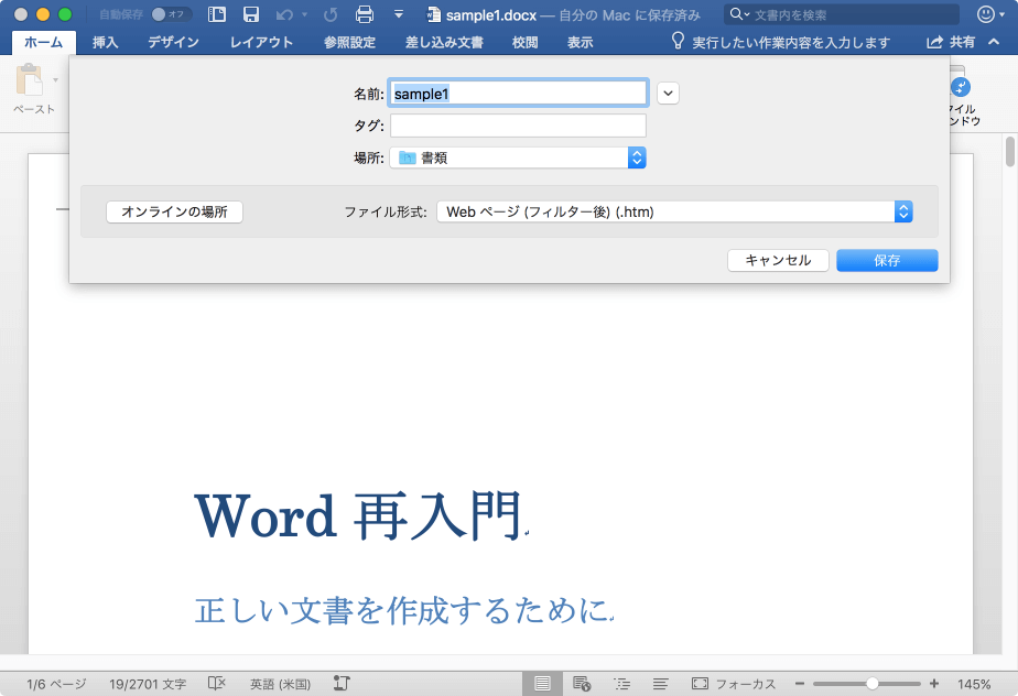 Officeの固有のタグを除去してHTML形式で表示情報だけを保存するには、フィルター後のWebページで保存するとよいでしょう。[ファイル]メニューの[名前を付けて保存]を選択し、フォーマットを[Webページ (フィルター後) (.htm)]にします。ただし、このページをもう一度開いたときに、Office の一部の機能が使用できなくなる可能性があります。