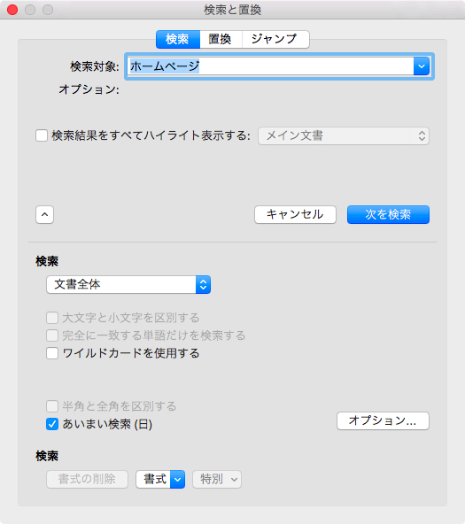 [検索と置換]ダイアログボックスの左下の