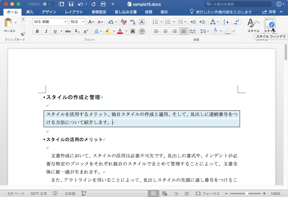 - 対象となる既存の書式を選択し、[ホーム]タブの[スタイル]グループの[スタイル ウィンドウ]ボタンをクリックします。