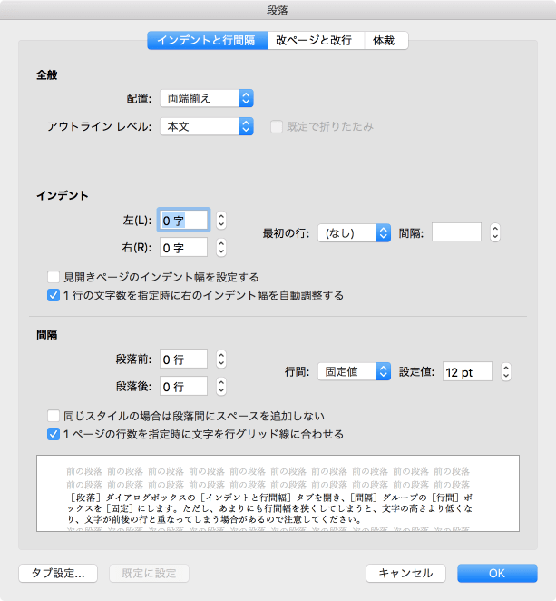 [段落]ダイアログボックスの[インデントと行間幅]タブが開くので、[間隔]グループの[行間]を[固定値]にして[OK]ボタンをクリックします。