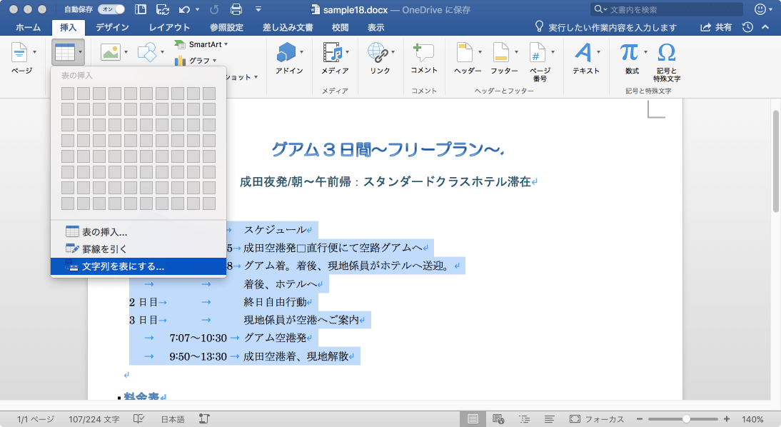 ここでは、サンプルファイル内のタブ区切りの文字列を選択して、列幅が文字列の幅に自動調整される表に変換する方法について説明します。