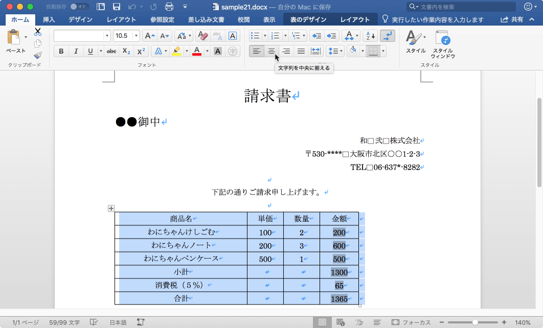 表内にカーソルを移動し、[表のプロパティ]ダイアログボックスを表示して、表の配置を中央揃えにします。もしくは、表全体を選択して、[ホーム]タブの[段落]グループにある[中央揃え]ボタンをクリックしてもOKです。