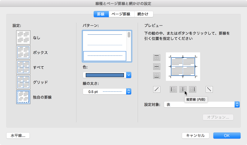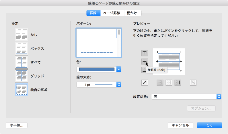 - 下の図のように横罫線(内側)のボタンをクリックすると、プレビューが反映されます。