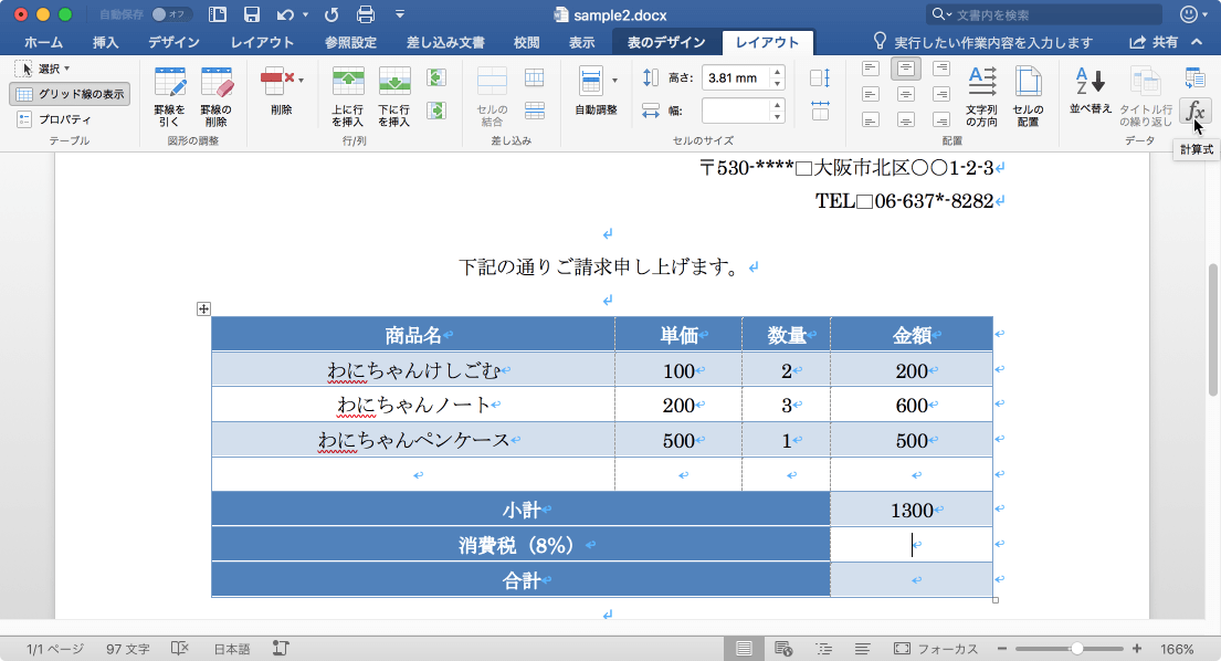 Wordの表内のセルに合計を求めるには、Excelと同様SUM関数を使います。合計を求めるセルにカーソルを移動し、[レイアウト]タブを開き、[データ]グループの[計算式]をクリックして、合計を求める対象のセルを指定します。