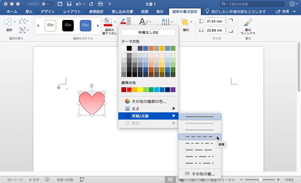 - [図形の輪郭]一覧より[実線/点線]をポイントして、線のスタイルを選択します。