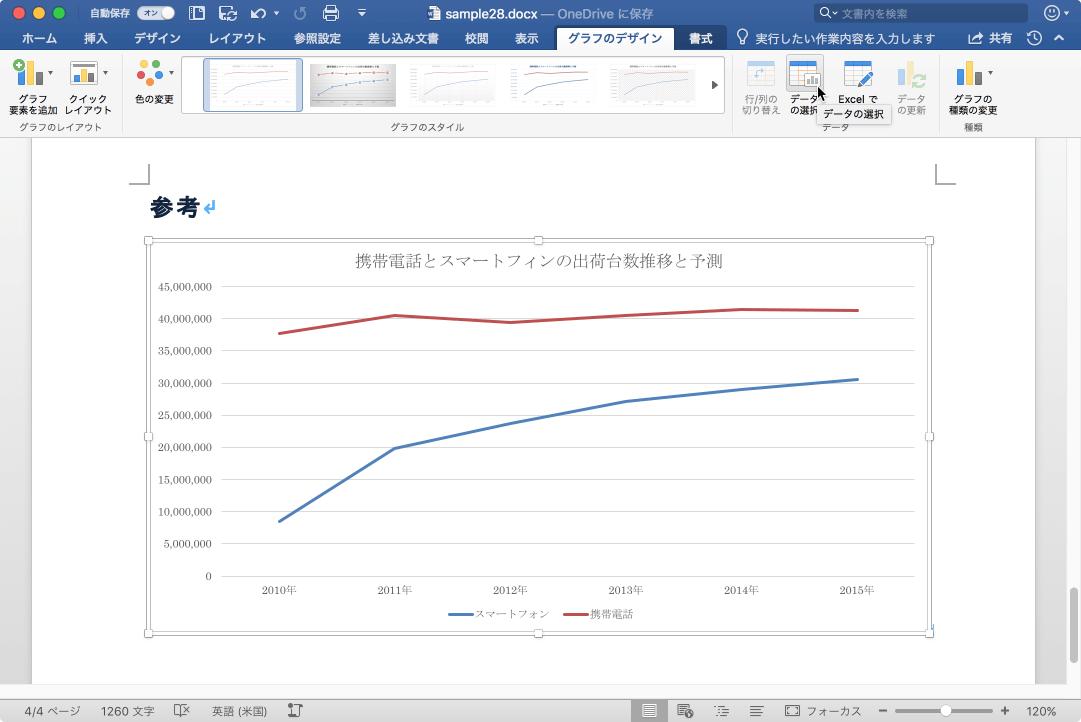 グラフのデータ範囲を変更したり、系列を追加または削除したりするには、グラフを選択して[グラフのデザイン]タブを開き、[データの選択]をクリックします。
