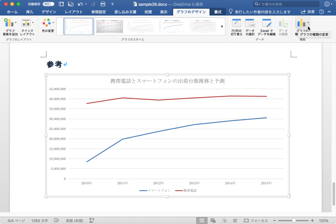 たとえば、折れ線グラフから棒グラフに変更するには、グラフを選択して[グラフのデザイン]タブを開き、[グラフの種類の変更]一覧より変更したいグラフを選択します。