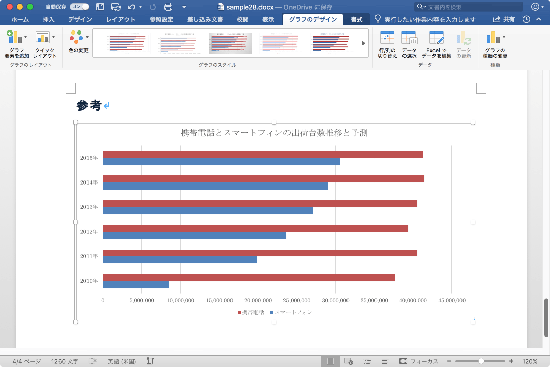 - グラフを選択して[グラフのデザイン]タブを開きます。