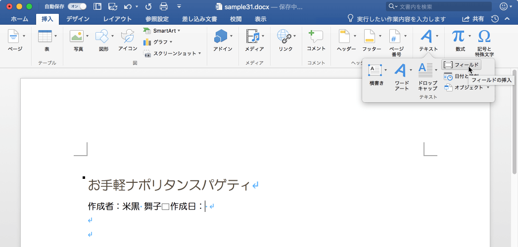 挿入したい場所にカーソルを移動して[挿入]メニューの[フィールド]をクリック、もしくは[挿入]タブを開き[テキスト]グループの[フィールド]をクリックして、[日付と時刻]より[Create Date]を選択します。