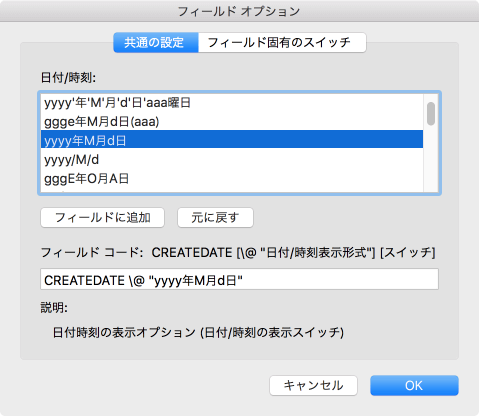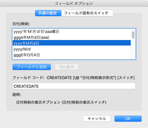 - [日付/時刻]一覧から書式を選択して[フィールドに追加]ボタンをクリックします。