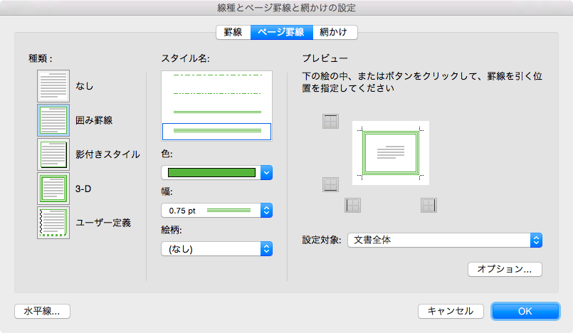 ここでは、ページの端に「緑、アクセント6」の色で、0.75ptの太さの三重線の罫線を囲む方法について説明します。