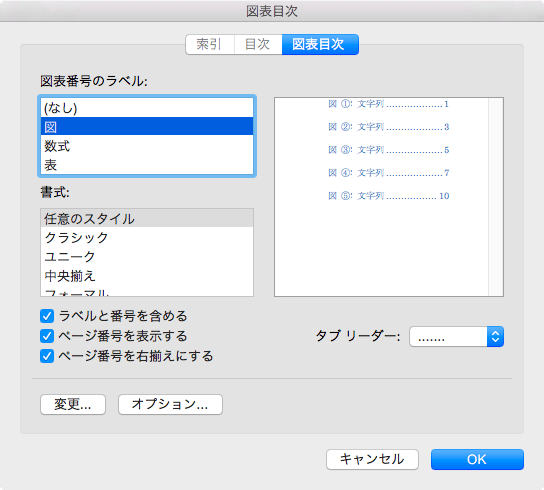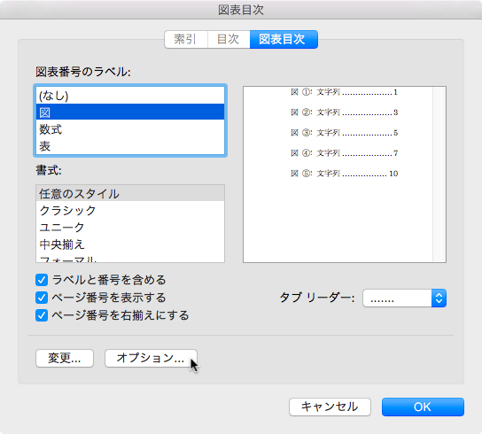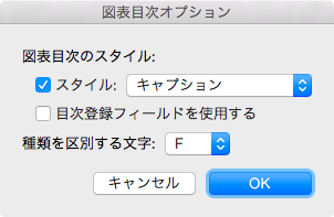 - [図表目次オプション]ポップアップメニューで図表に使用するスタイルを選択して[OK]ボタンをクリックします。