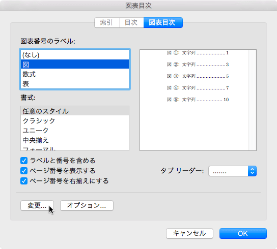 図表目次のスタイルを変更するには