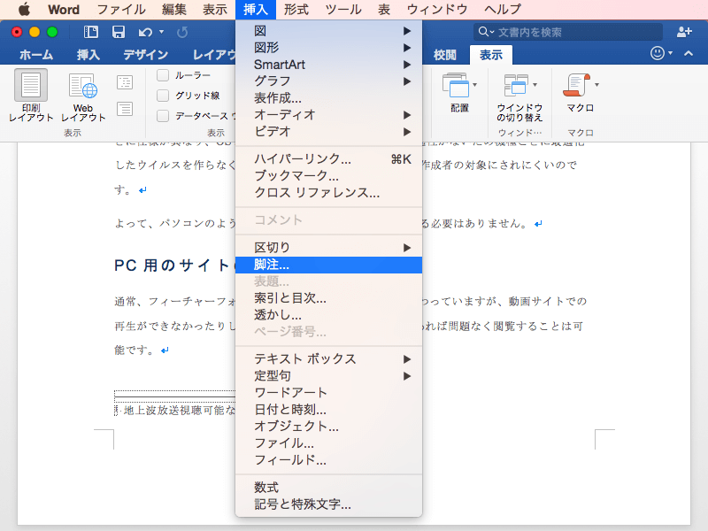 - 脚注内容の領域外にカーソルを移動し、[挿入]メニューの[脚注]をクリックします。