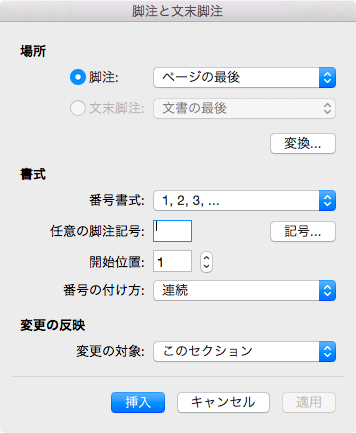 - [脚注と文末脚注]ダイアログボックスが[キャンセル]ボタンのままの場合、もう一度、手順2~3を繰り返します。