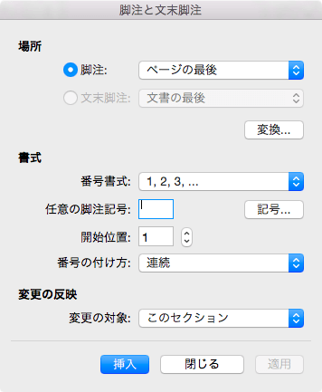 - [脚注と文末脚注]ダイアログボックスの[閉じる]ボタンをクリックします。