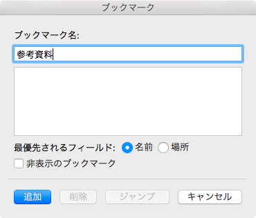 - [ブックマーク名]ボックスにブックマーク名を入力します。ここでは「参考資料」と入力します。