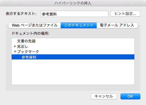 - ドキュメント内の既存の場所ポップアップメニューでブックマーク名(参考資料)を選択して[OK]ボタンをクリックします。