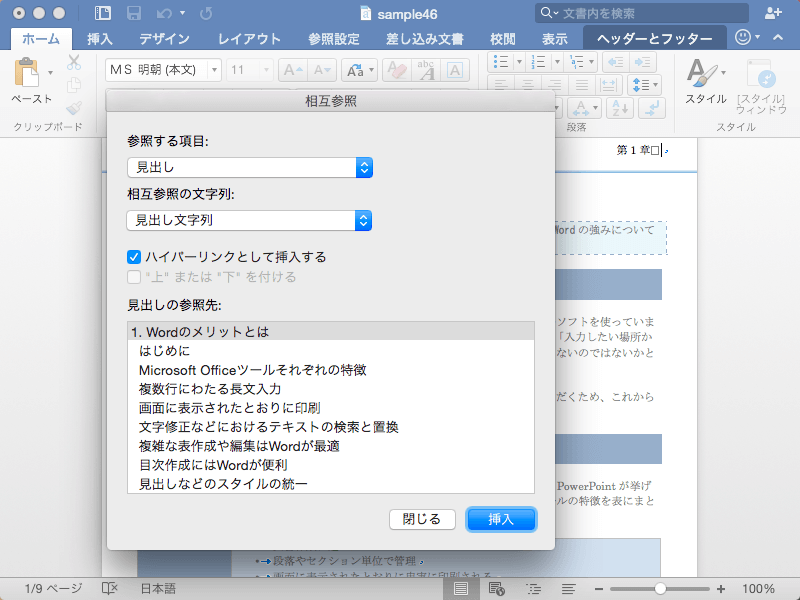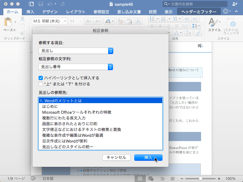 - 見出し番号を入れるには、[相互参照]ダイアログボックスの[参照する項目]を「見出し」に設定し、[相互参照の文字列]を「見出し番号」に設定して、見出しの参照先を選択し、[挿入]ボタンをクリックします。