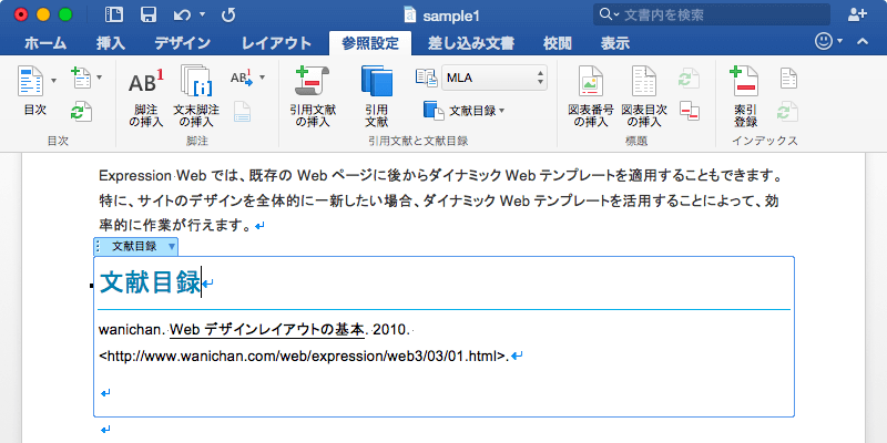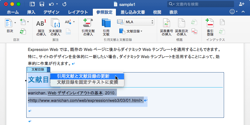 文書に引用文献の一覧または文献目録を挿入した後で新しい資料文献を追加する場合、引用文献の一覧または文献目録にその新しい資料文献が含まれるように更新できます。文献目録のプレースホルダーのメニューから[引用文献と文献目録の更新]を選択します。